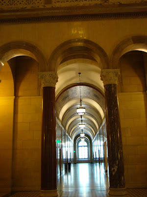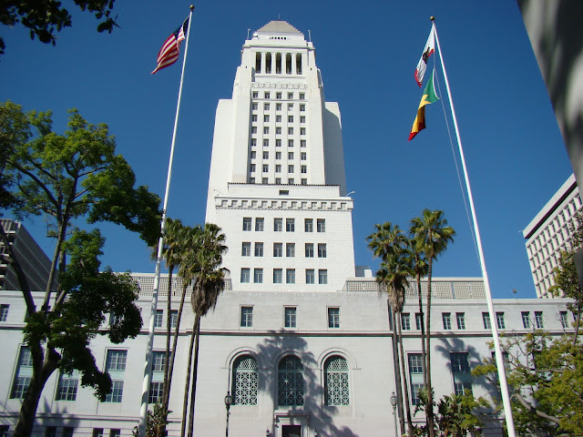 The City Hall building is one of my favorites to look at. It has been featured in many films; War of the Worlds, Mission Impossible, Escape from L.A., to name a few. It was completed in 1928 and just recently retrofitted to withstand an 8.0 earthquake. It is located on First and Main Street in downtown Los Angeles. An observation level is open to the public on the 27th floor (the area way at the top with the long columns).